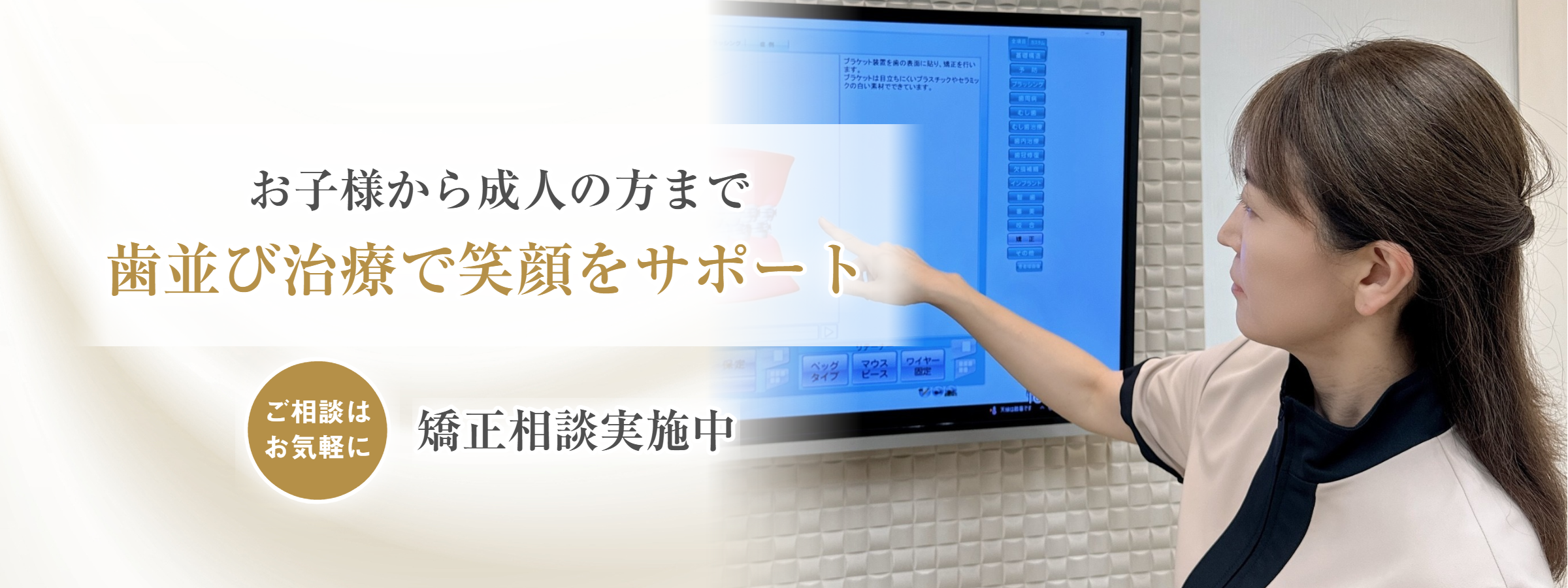 当院では副院長が、歯並びを整える矯正治療を行っています。お口の中で目立つ金属の矯正器具に抵抗を感じるという患者さまのために、クリアブラケットやホワイトワイヤーおよびマウスピース矯正といった目立たない矯正装置をご用意しています。